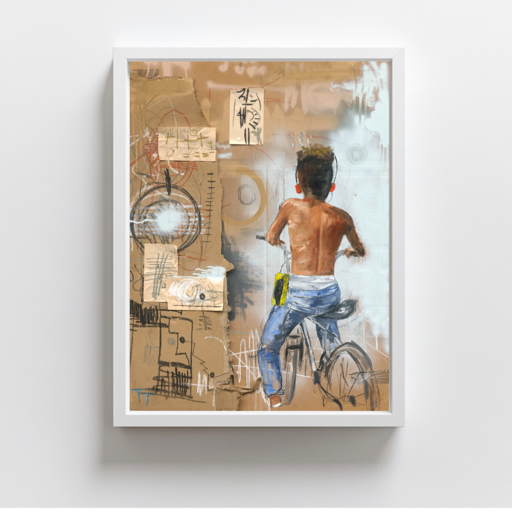 This work is about Sol, a young dreamer on the path to self-discovery. The process of creating this work involved music - specifically the song "Porcelain" by Moby. The painting involved little thought and flowed from what the music inspired via a wide array of materials and colors. The result is the chaotic dream world of an enchanted young boy.